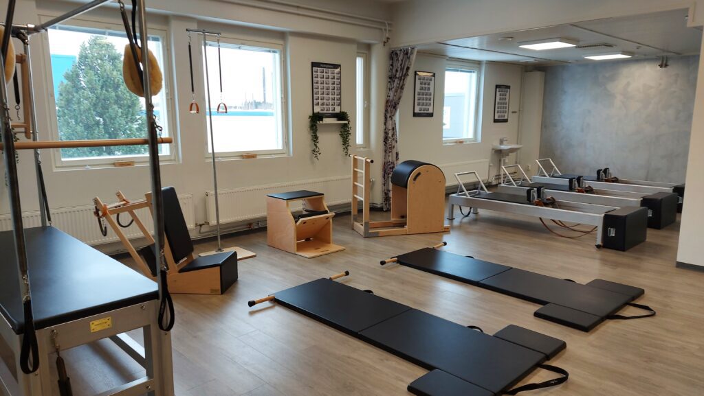 Reformer- ja mattoharjoittelussa opiskelimme uusia liikkeitä, aiemmin opittujen liikkeiden vahvempaa hallintaa, tarkkuutta, rytmiä, erilaisia siirtymiä liikkeiden välillä sekä hengitystä. Totesimme myös, että Footwork muuttuu ja tuntuu kehossa aivan uudella tavalla, kun sen pääsee kokemaan Wunda Chairilla. Kehon tarpeisiin sopivia liikkeitä harjoittelimme Cadillacilla, Spine Correctoreilla ja osa pääsi koeajamaan myös uuden Ladder Barrelin ja Arm Chairin.