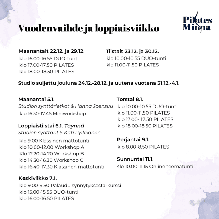 Pilates studiolla liikutaan myös joulun ja uuden vuoden aikaan. Loppiaisviikolla juhlitaan studion 6-vuotissynttäreitä. Maanantaina 5.1. pidetään synttäreiden etkoja, jolloin studiolla Minnan kanssa on ohjaamassa Pilates